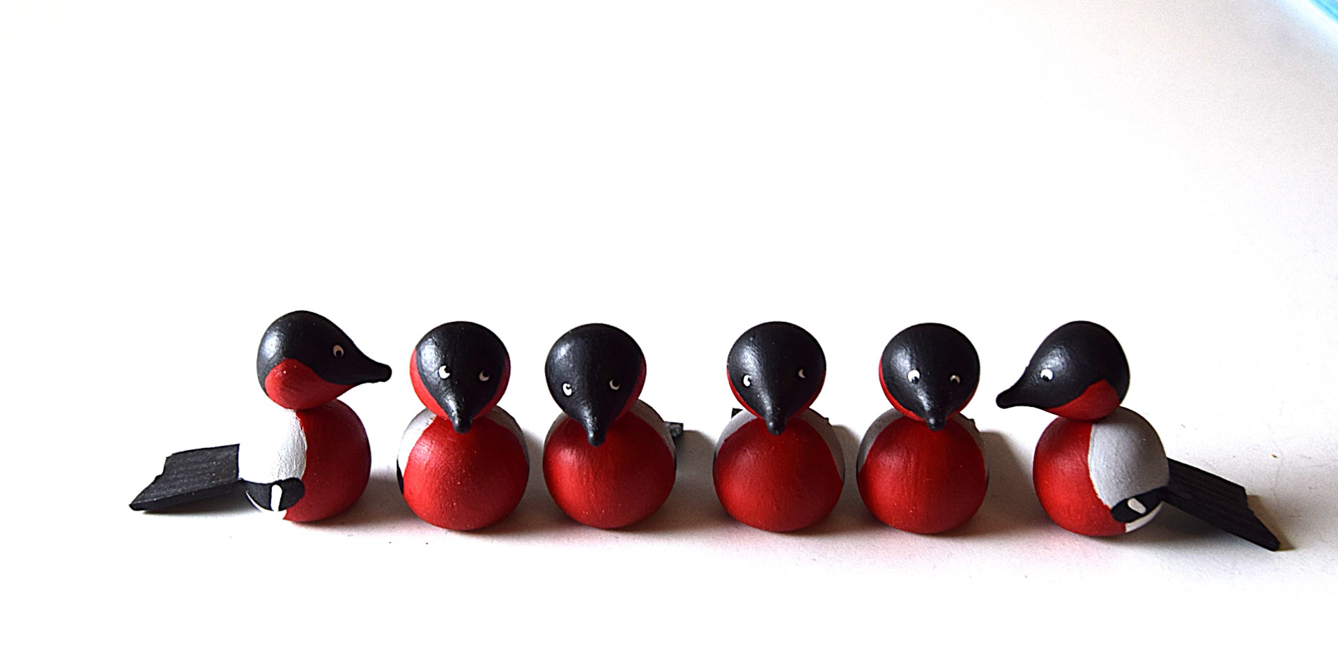 Handmålade domherrar gjorda av björkträ från Norrland.